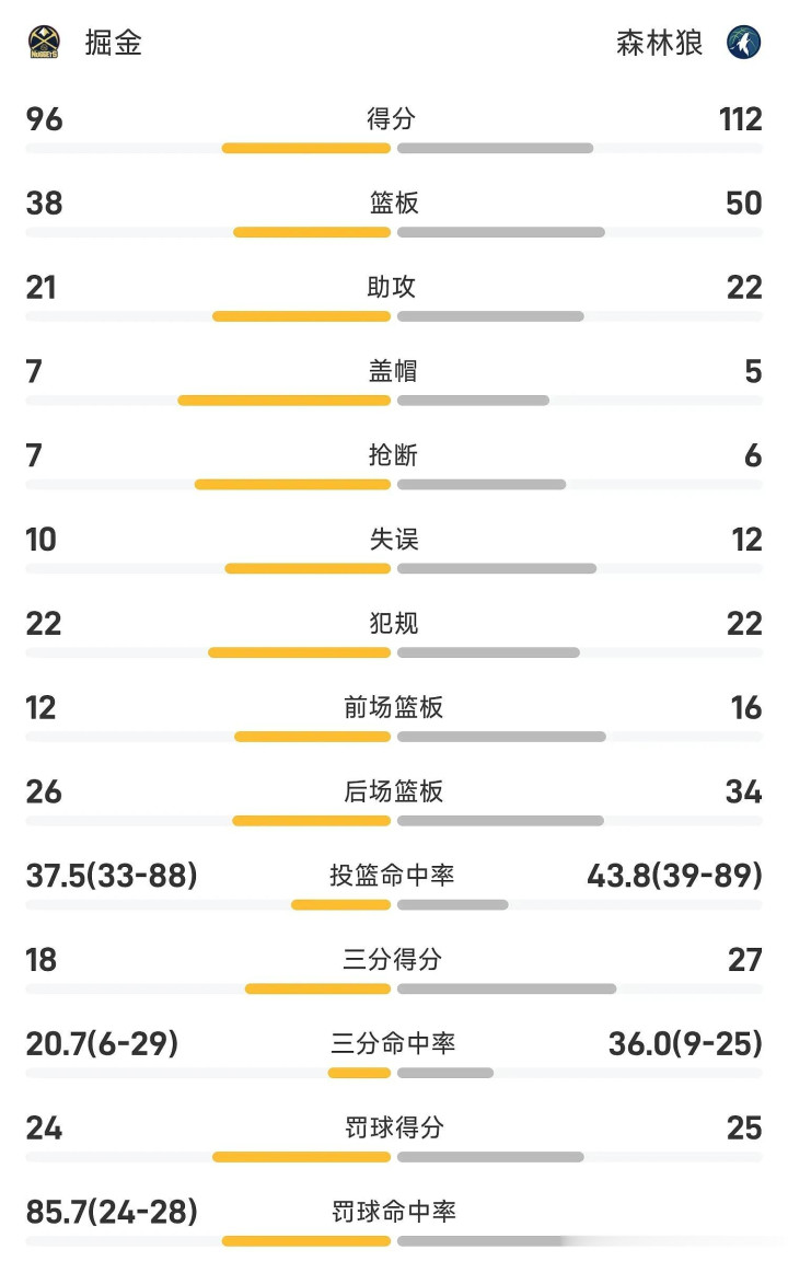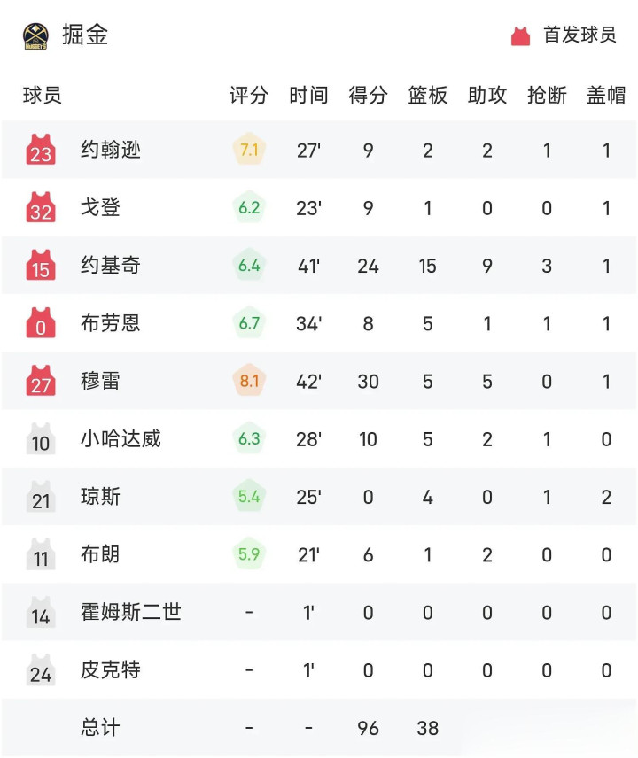 掘金后卫小哈达威手感欠安,出场27分钟10投3中,三分6中0、罚球5中4拿到10分5篮板2助攻1抢断,正负值+1;掘金球员穆雷此役依旧是球队的主要得分点,天然他在第四节把持11分匡助球队发奋追分,但无奈球队其他球员情状欠安最终也曾只可吞下败果,他出场41分59秒,25投10中(三分7中3),罚球7中7,拿到30分5篮板5助攻1盖帽,正负值-13: