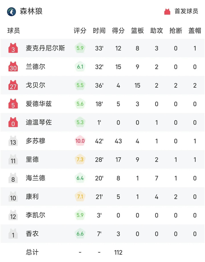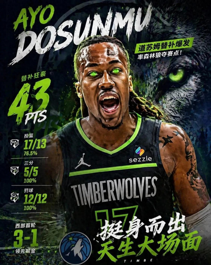 本场比赛,丛林狼后卫迪文岑佐、爱德华兹一皆遇到大伤退赛,谈苏姆扛起得分之责,多森姆在季后赛单场比赛替补出战拿到43分,是NBA历史上季后赛单场替补球员得分第二高,仅次于1976年弗雷德-布朗的45分。而两位在季后赛单场替补40+的球员是库里(2016年、敌手是开荒者)和范·埃克塞尔(2003年、代表独行侠对阵国王),他们各自都是单场40分。本场,谈苏姆投篮17中13,三分5中5,罚球12中12,除了43分,还孝顺4篮板2助攻。